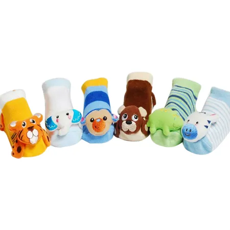 Highlighted here is a baby sock for 0-6 month olds to wear. It comes in a colorful design and is adorned with a cute animal head of a tiger, an elephant, a monkey, a bear, etc. This baby sock is comfortable to wear and can also be used as a rattle toy for babies.