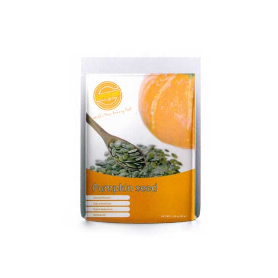 Displayed is a bag of raw pumpkin seeds. Coming from high quality pumpkins, this seed has a refreshing natural fragrance and taste. This raw pumpkin seed is a good source of protein and minerals.