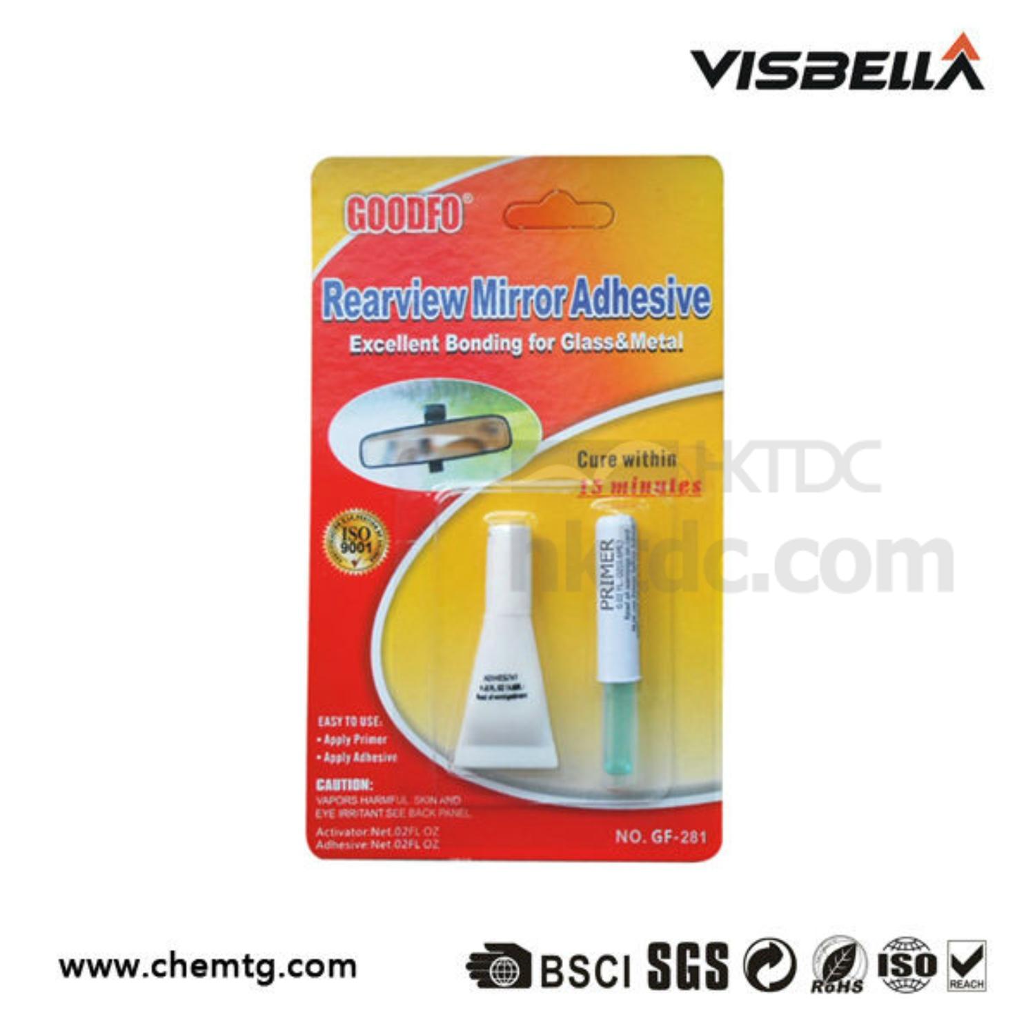 Rearview mirror adhesive is two parts component glue, but notice no mixing of the two parts.it is extra strong and fast acting. It outperforms epoxie and super glue type products.Holds up well in high temperatures and humid environments. Two part structural acrylic system designed to mount rear view mirror. Rearview mirror adhesive kit woks mainly on where rearview mirror broken and brackets to windshield in second. Also can be used to bond metal to metal ,glass to glass, glass to metal, ceramics, jewelry and anything else you can think of.