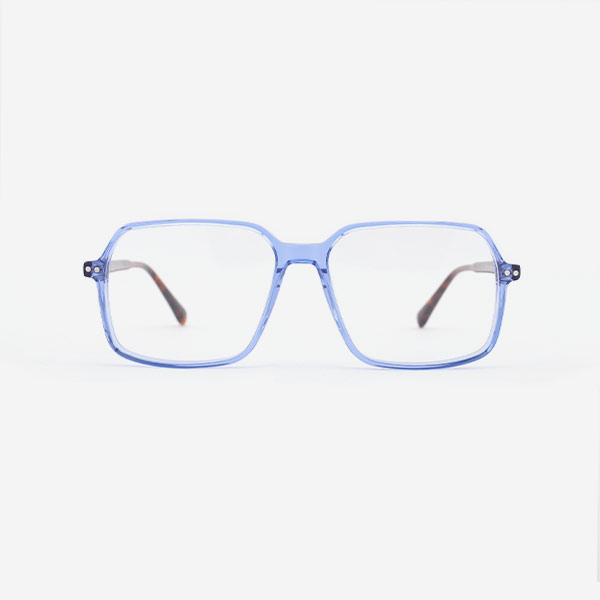 This optical glasses made in Acetate material, built-in acetate nose pads. Handmade. The design features rectangular, simple lines and translucent colors, together with the translucent temples with metal cores. Specially for fashion ladies and gentlemens applying different occasions.