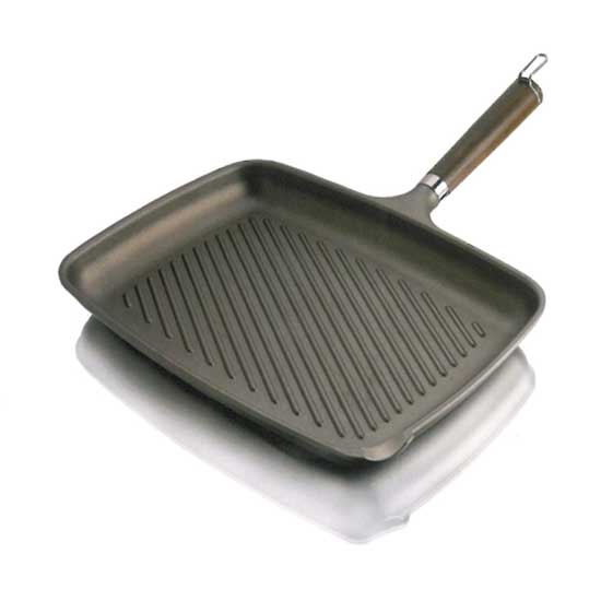 The rectangular grilling pan features diagonal ridged styling for cooking steaks. The ridges promote healthy cooking by trapping extra grease. The rectangular grilling pan is great for preparing western dishes.