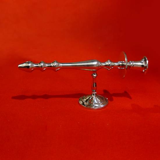 This is a religious ornament. The pillar candle holder is made of metal. This candle holder is made in a symmetrical shape.