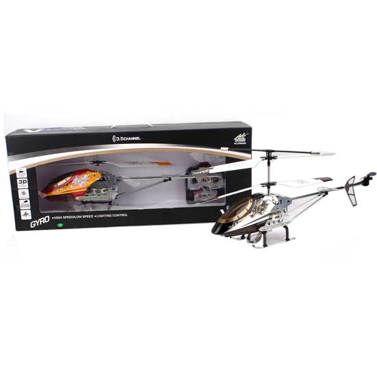 This helicopter is equipped with a gyroscope for stable flight. The streamlined shaped body comes with metallic paint for a handsome look. The remote control provides 3 functions for great fun at both indoors and outdoors.