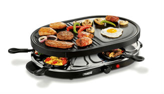 Handy and convenient grilling is easily managed with this tabletop grill. It further comes with 8 reclette pans and 8 wooden spatulas as a full set. All plates are removable with non-stick coating for easy washing.