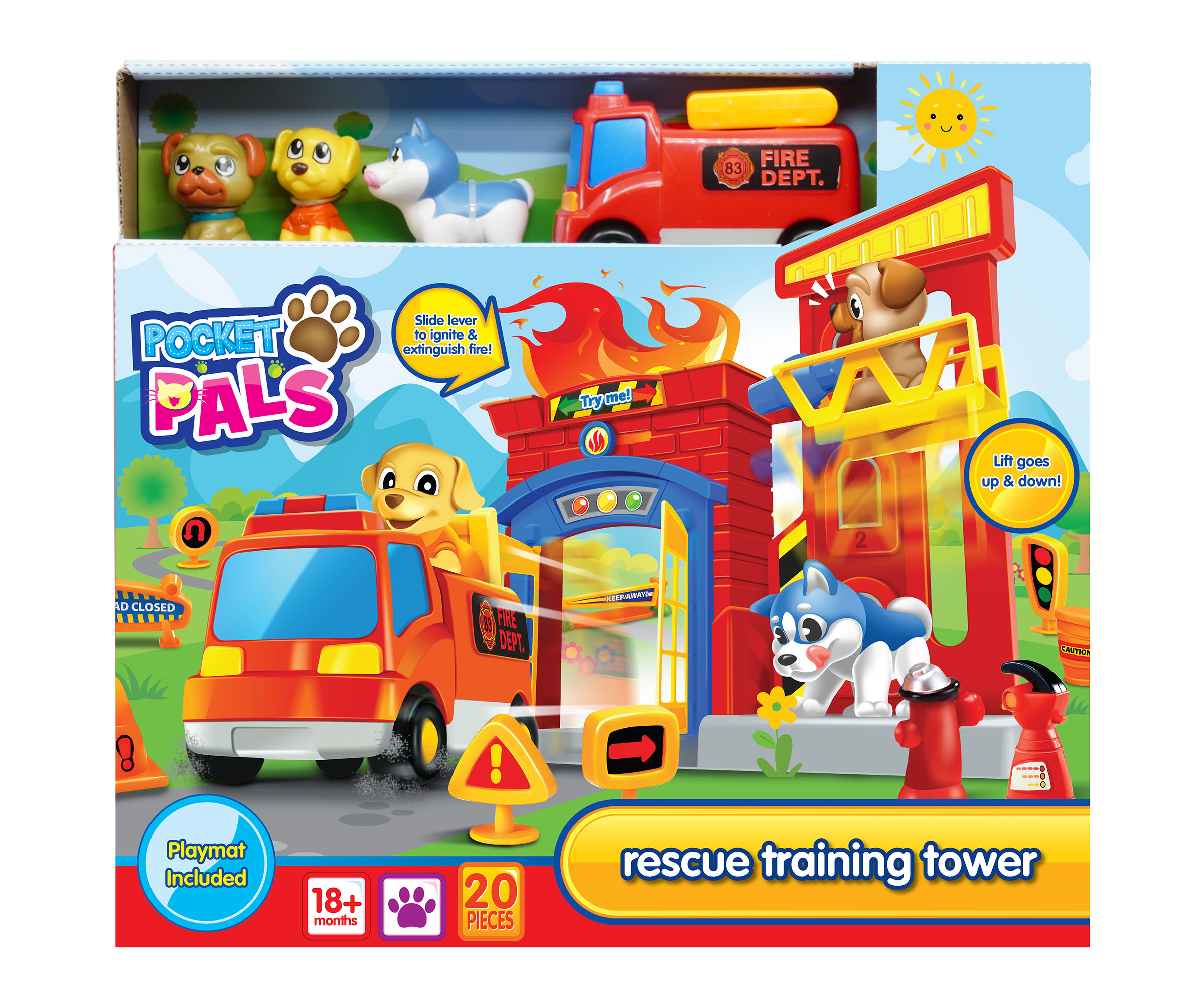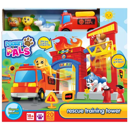Pieces count : 20 pieces. Includes rescue training tower, 3 dogs, 1 free wheeling fire engine, accessories, 1 paper playmat.