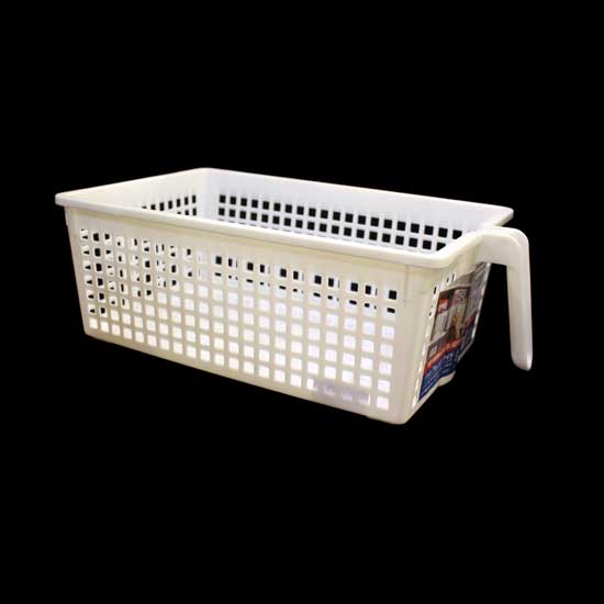 This resin basket features a rectangular-shaped body in mesh construction. The handy resin basket is ideal for organizing assorted kitchen tools. The side handle guarantees easy carrying.