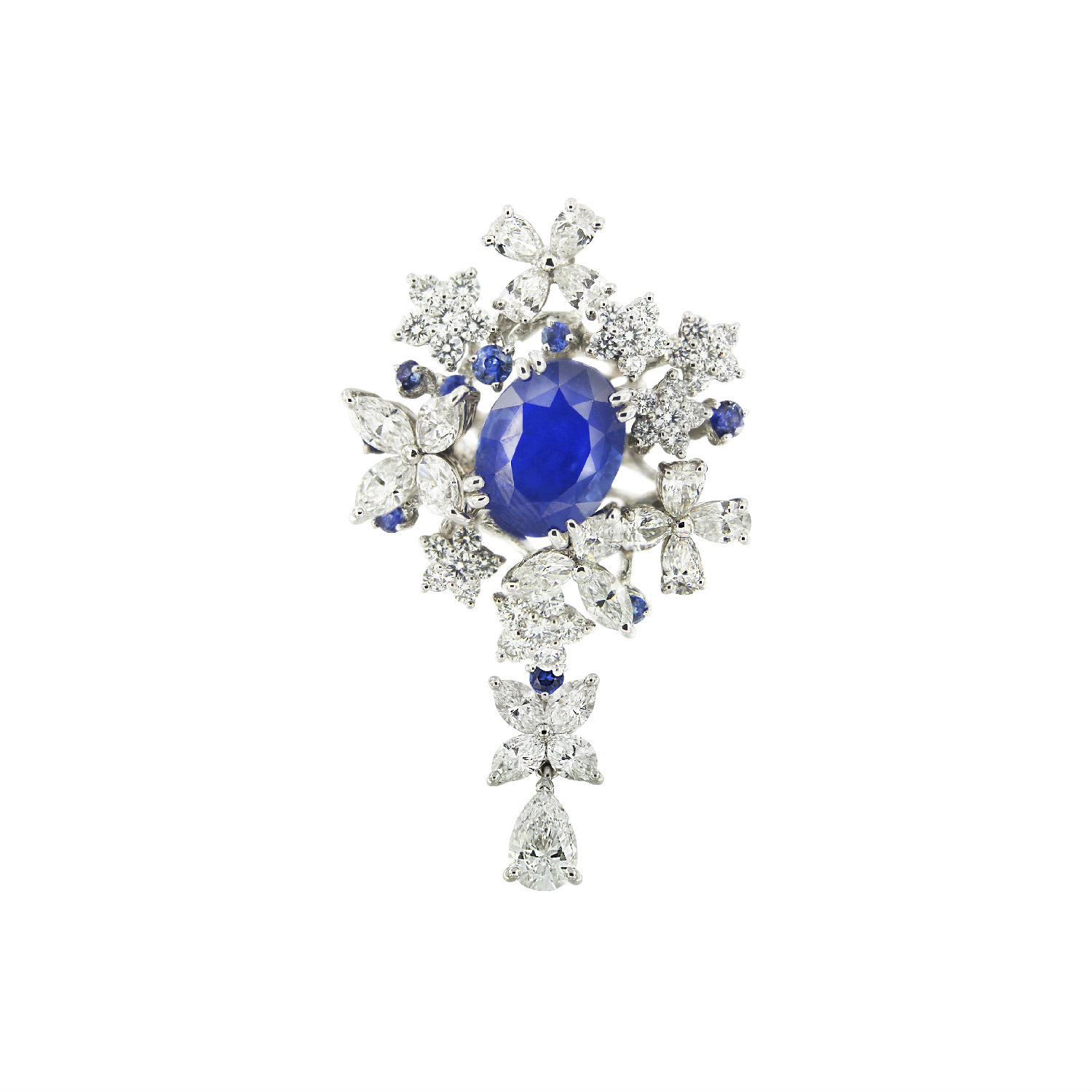 Set in 18K white gold with white diamonds, blue sapphire and non-heat cornflower blue sapphire.