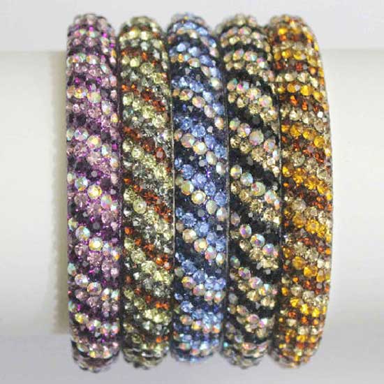This eye-catching bangle comes with glinting rhinestones arranged in oblique stripes. The rhinestones are made of crystal stones and are set on a brass base. This totally handmade bangle makes a tasteful accessory for your wrist.
