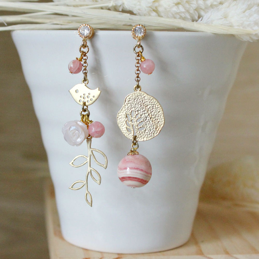 These drop earrings come in a mismatched design for added uniqueness. One earring exhibits a cutout branch of leaves, a shell flower and a cutout bird, while the other one displays a cutout disc and a large round rhodochrosite bead. These drop earrings are set on silver post backs for convenient wearing.