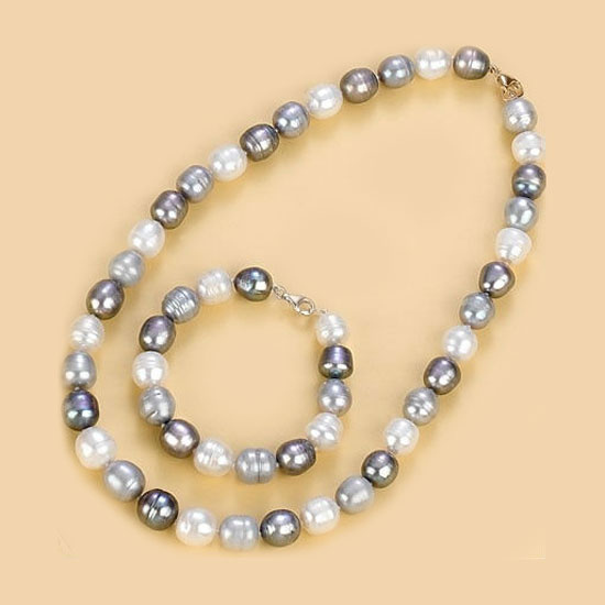 This pretty necklace and bracelet set is finely crafted from rice pearls in white, gray and black colors. The high-grade rice pearls exhibit alluring luster and shine. The necklace and bracelet are secured with silver lobster claw clasps.