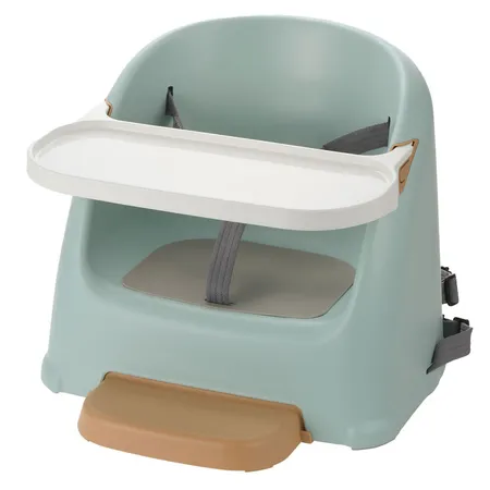 Ergonomic baby feeding chair designed to promote correct sitting posture. Includes a supportive backrest, seat pad, wide tray and footstep, and can be used as a floor seat or fixed to a dining chair.
