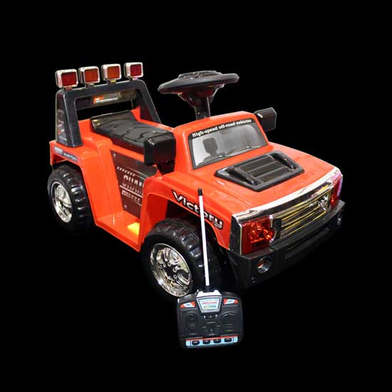 This is a high-speed off-road vehicle for babies featuring an eye-catching red and black exterior. It is designed with sound and flashing lights for extra appeal. This remote-controlled ride-on car is a welcome gift for your little one.