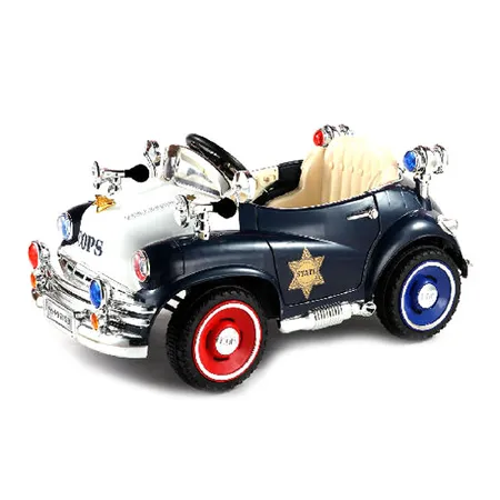 This is a ride-on car with a black and white finish.