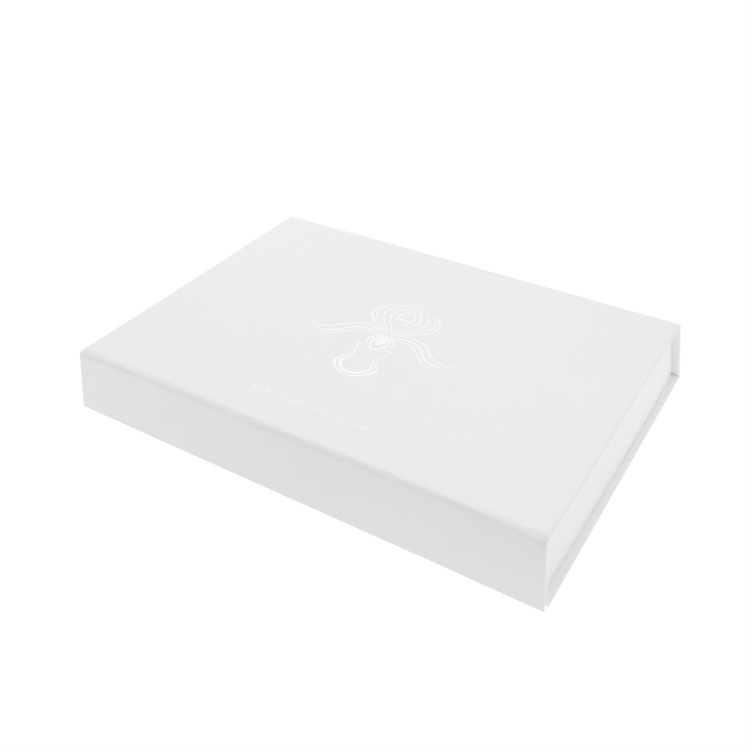 This rigid gift box is made of paper and comes in a flat packable design. It comes in a rectangular shape and has a paper insert inside for securing the contents in place. The gift box is decorated with a logo on the lid and offers an excellent packaging solution for cosmetic products.