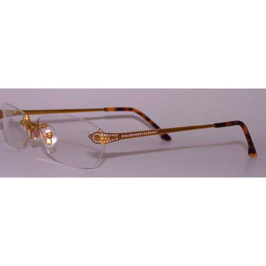 Shown here is a rimless spectacle frame with a luxurious design. The end pieces and temples are made of 18K gold. You can also find shimmery diamonds on the frame.