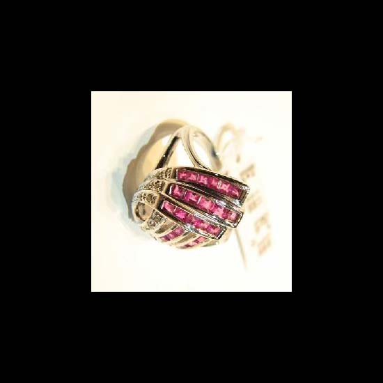 Translucent princess cut invisible set red sapphires are placed on the channel set of the ring