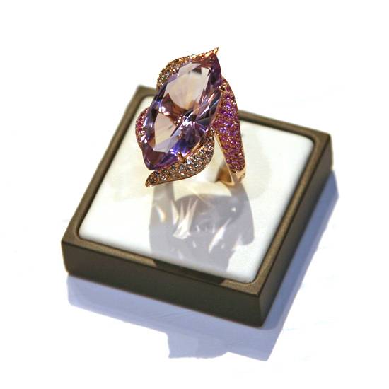 Elegantly designed ring with a marquise cut pink stone as the master stone. The main stone is surrounded with multiple round cut white and pink stones in bead setting.