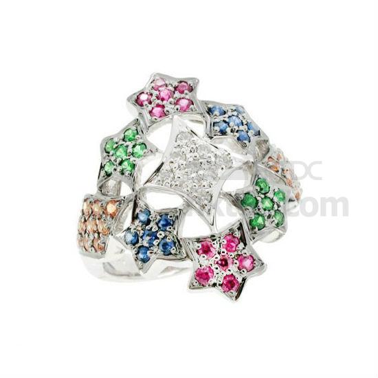 Set to catch the eyes of all, this spectacular 18-karat white gold ring is paved with glistening white diamonds and sparkling multicolored gemstones to give a dazzling shine. Wear yours with neutral hues and a polished manicure for the most sophisticated results.
