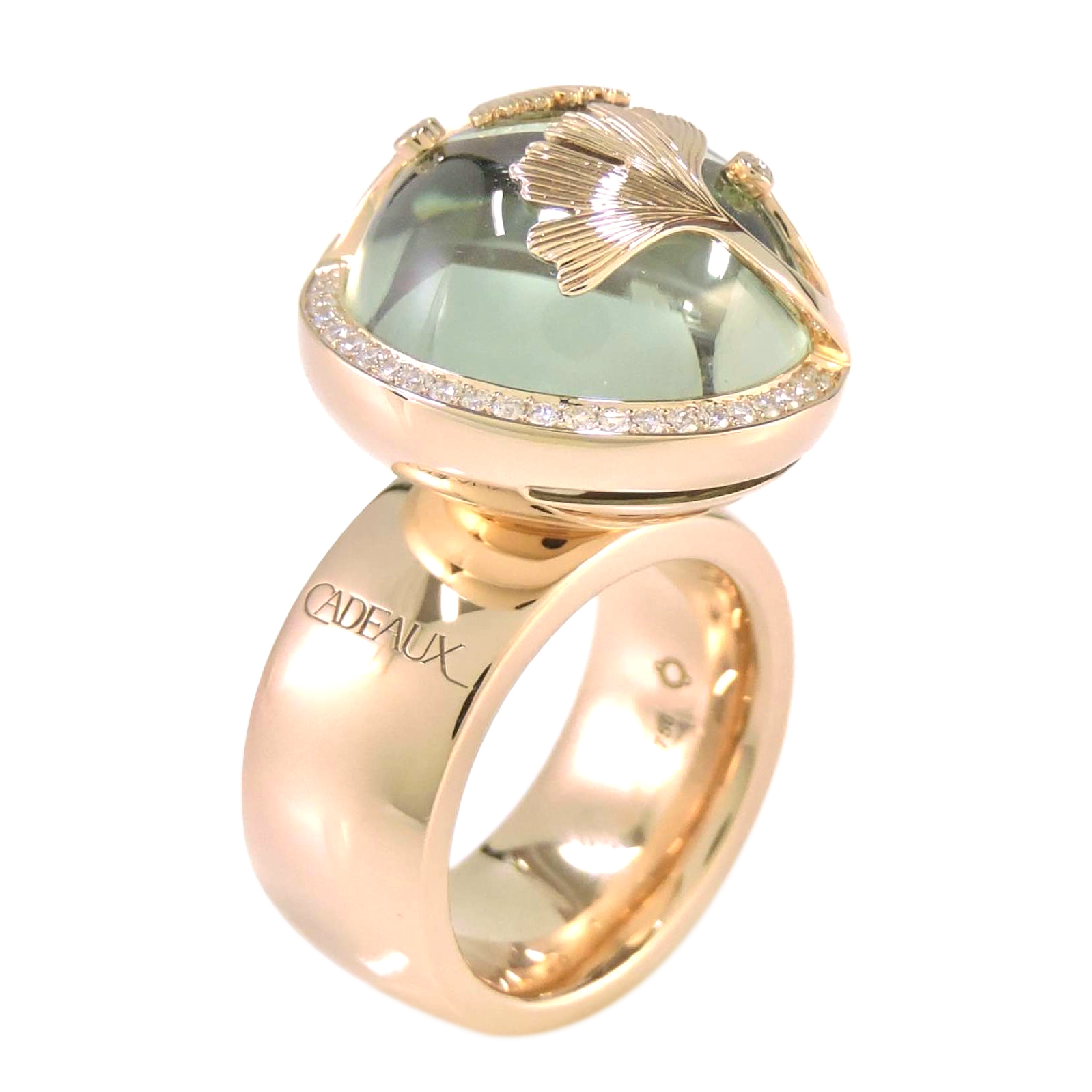 Ring Ginkgo Pirouette, createt in 2017 by Tevin Baechtold, combine the Ginkgo theme with a beautiful green Amethyst cabochon, which is set in a 18 Karat rose gold mounting. The Ring and the green Amethyst is surrounded and by handmade Ginkgo motives and diamonds.