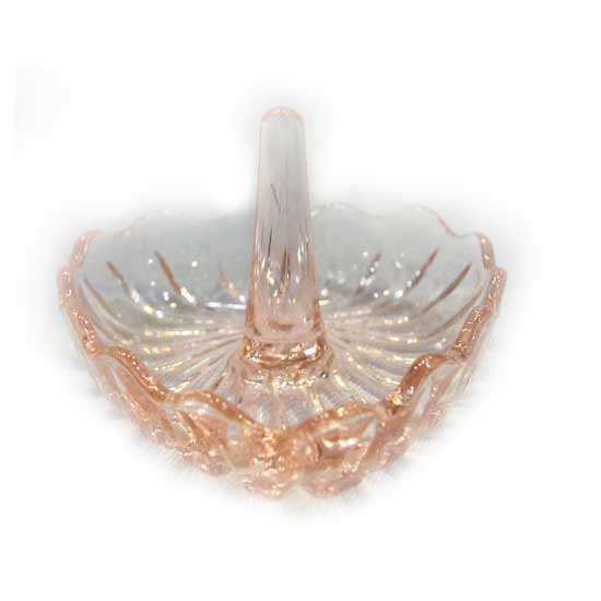 As shown is a ring holder which is made out of glass. This piece grabs attention with its glossy shell and wavy edge. It makes a useful and decorative tool for resting your precious collections.