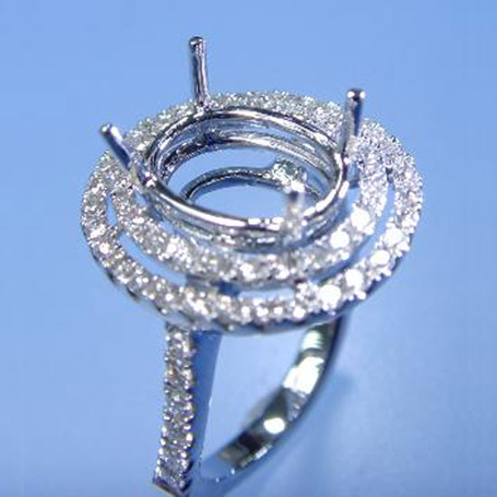 This is a ring mounting in 18K white gold. It is masterfully paved with sparkling diamond elements for added luxuriousness. This mounting matches well with various kinds of gemstones for an elegant look.