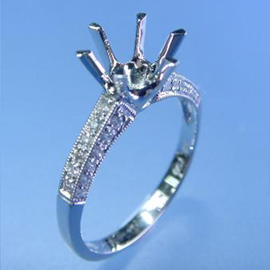 This is a ring mounting with a sturdy prong on top. It features an 18K white gold body with shimmering diamond elements. This ring mounting is made with excellent craftsmanship and attention to detail.