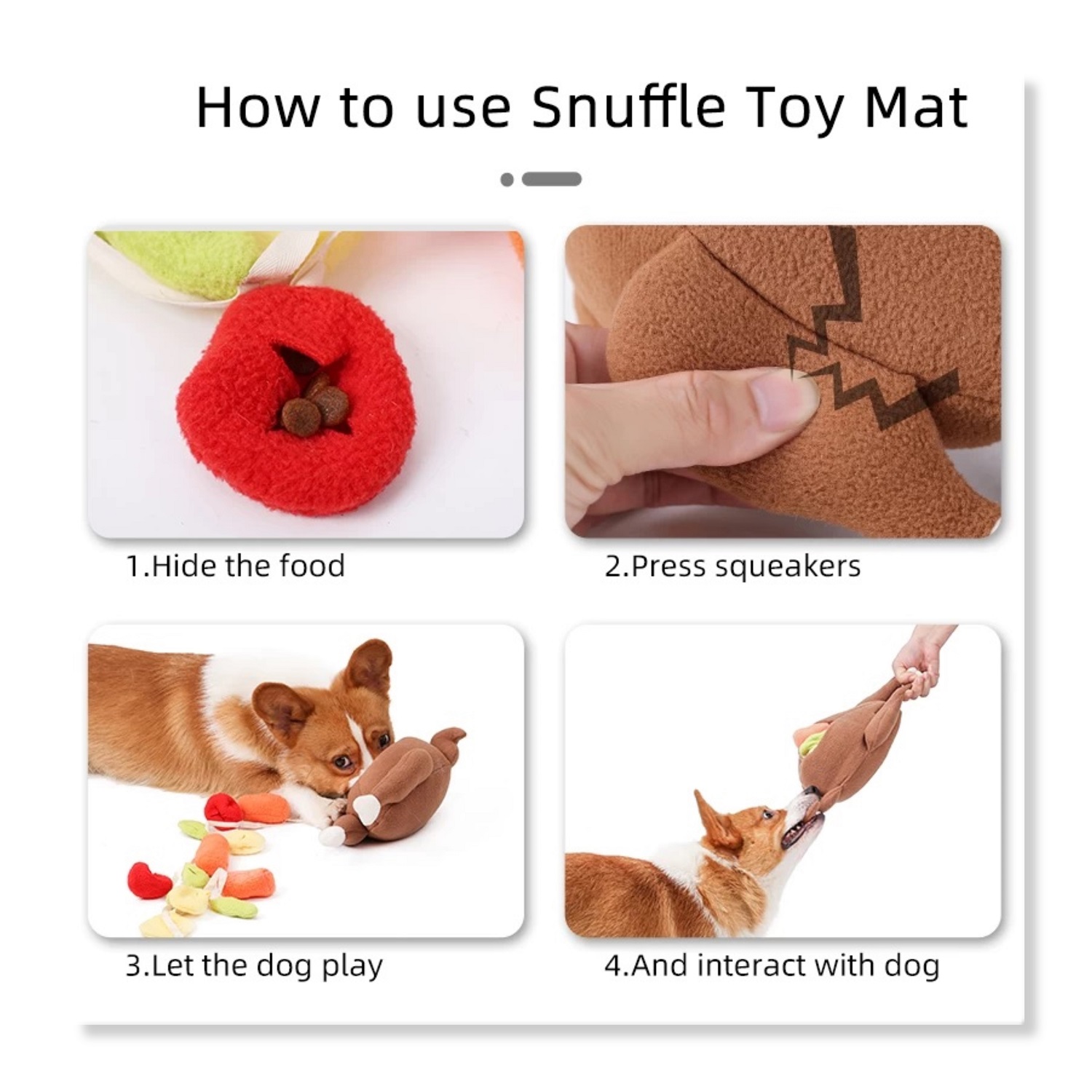 2. HAVE FUN: this snuffle dog toy is in roasted turkey design , and with squeaker inside to attract your dog's attention.