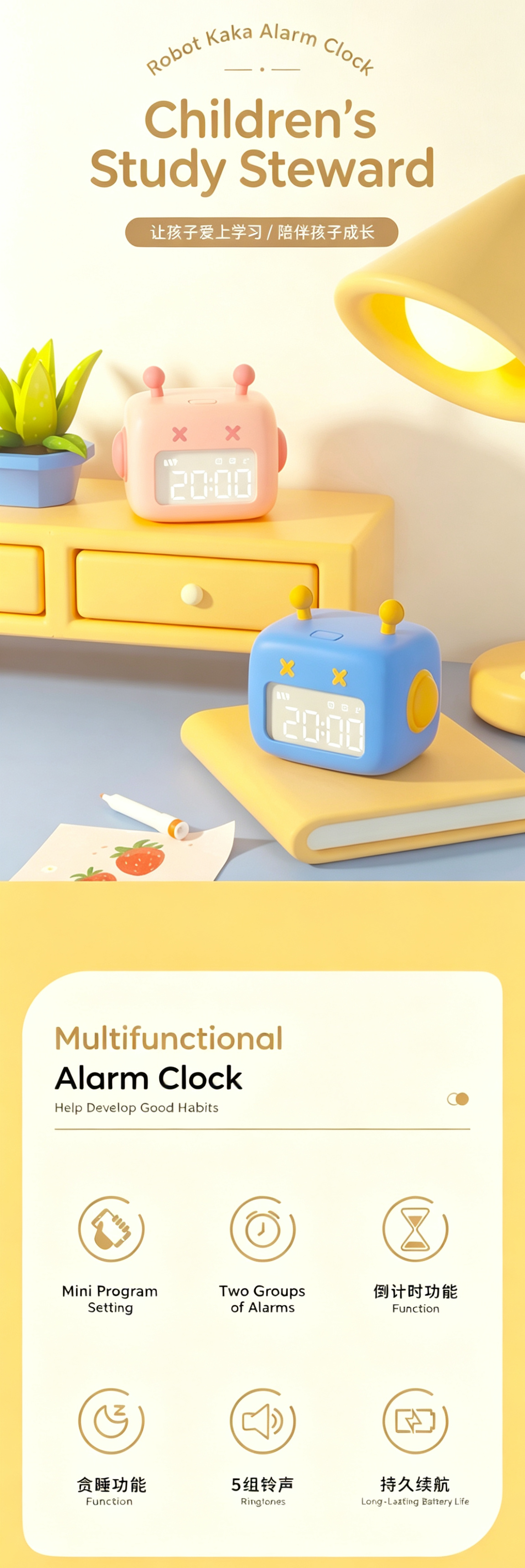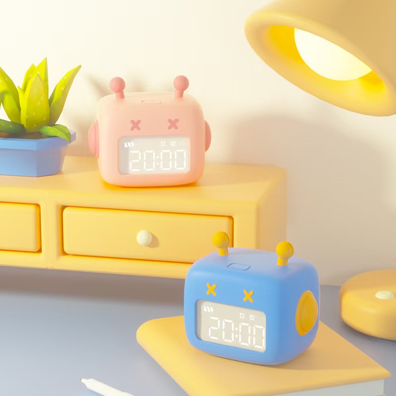 This cute robot-shaped alarm clock is an ideal study companion for students. It combines practical time-management functions to help develop good habits. With dual alarms, a countdown timer, and smart app control, it’s easy to use and fits perfectly on desks or nightstands. The safe silicone material and compact design make it kid-friendly, while the rechargeable battery ensures convenient daily use. Available in blue/pink, it’s both a functional tool and a lovely room decor.