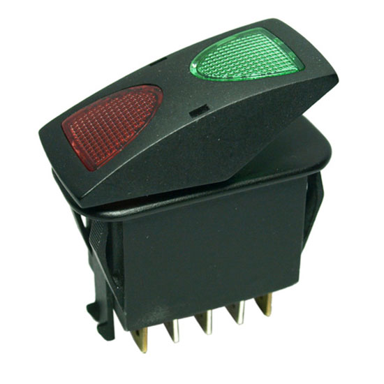 Pictured is a rocker switch with a waterproof and dust-proof design. The lenses are molded in PC in red, amber and green. The switch can be easily installed into the panel with snap-in mounting.