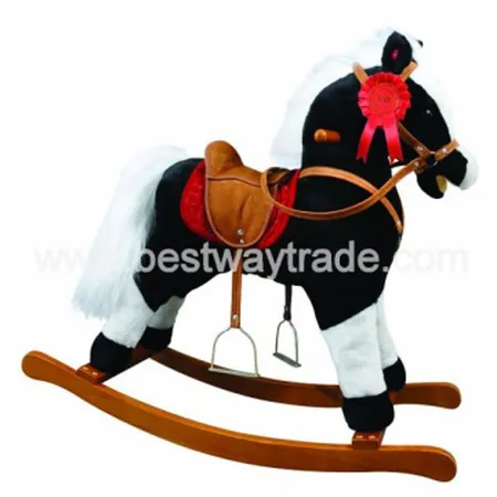 This detailed rocking horse comes with a soft plush surface. It has a cute appearance of a black body with white mane and legs. A red award ribbon adorns the head of this horse.