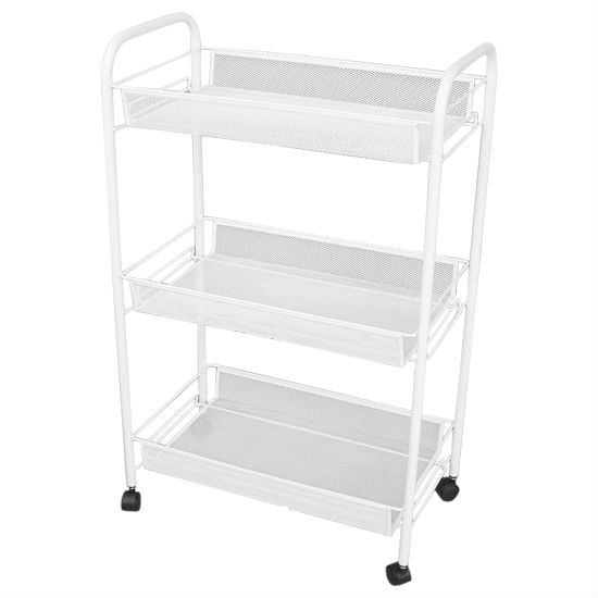 Featured here is a 3-tier utility rolling cart allowing you to move heavy or bulky item effortlessly. Each tier comes in a sleek mesh tray, of which side bars are designed to prevent items from falling off. Affixed with patented nylon castors at the bottom, this cart can be moved in all directions with the dual handles.