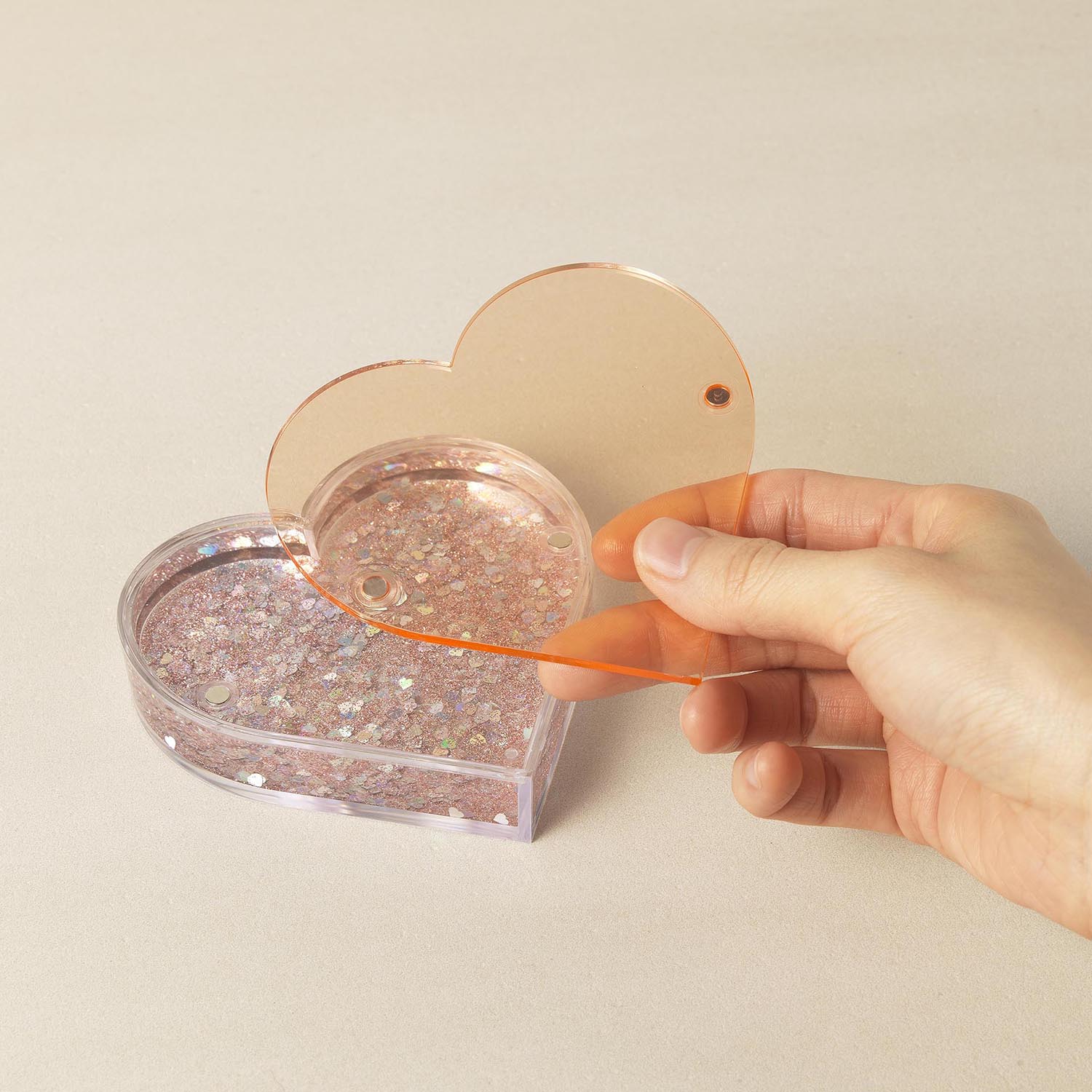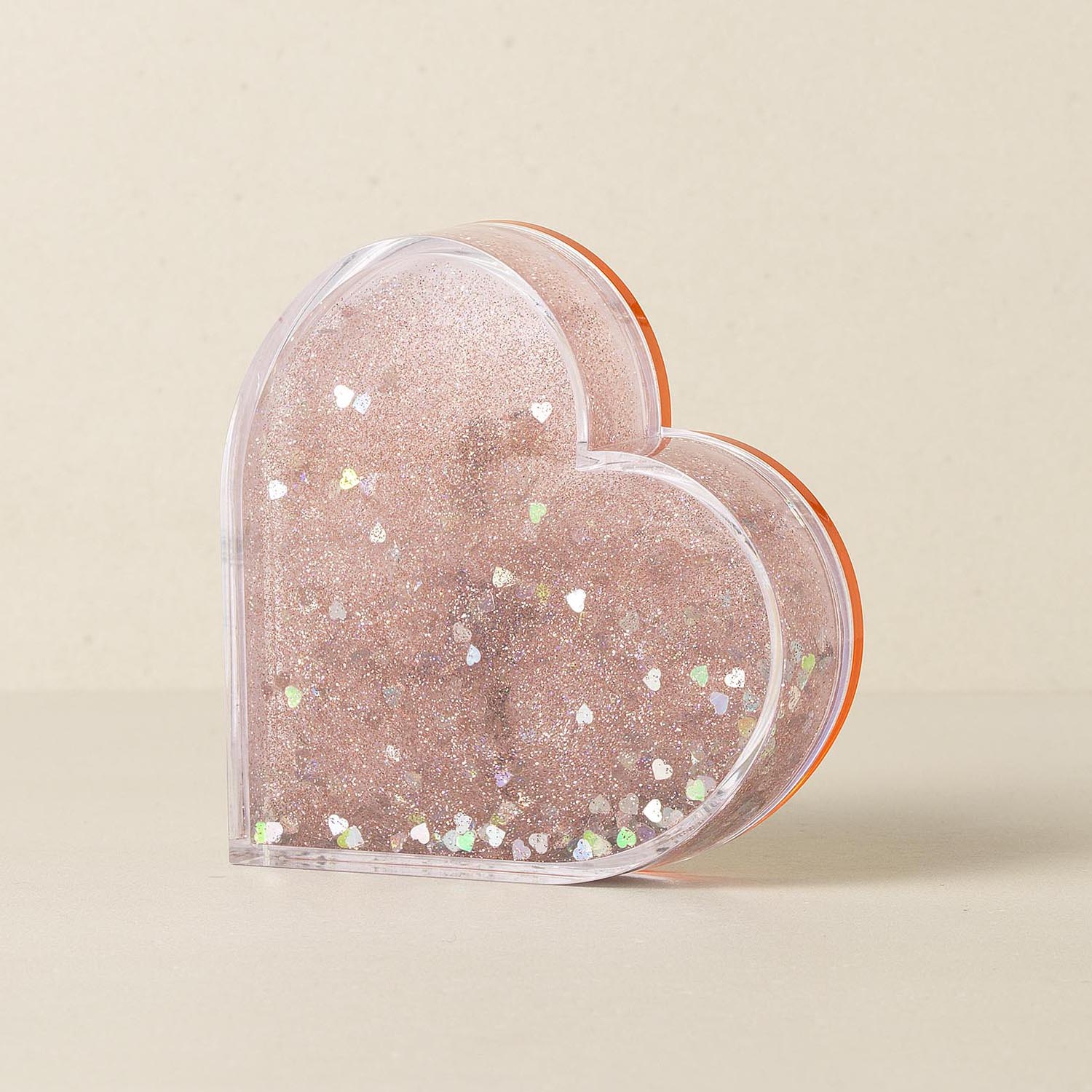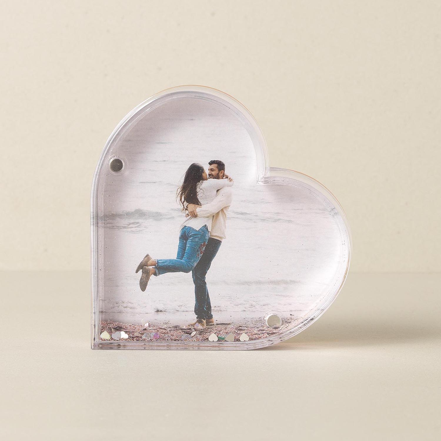 Heart glitter photo frame with a tinted magnetic back plate that is perfect for displaying your favorite photo, filled with water and shimmering glitter inside.