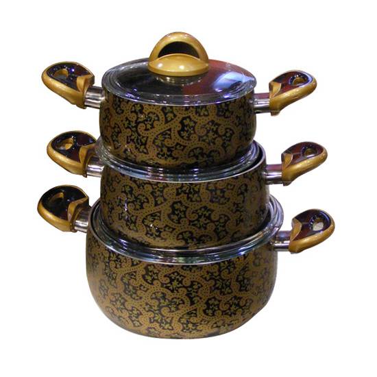 This is an enamelled cookware set with oriental decorations. The saucepans have a 3mm thick aluminium body and are made of 3 layers of PTFE. These aluminium pots have large handles for convenient use. The saucepans have a pyrex lid for monitoring food cooking.