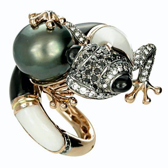 The dazzling ring flaunts an exclusive appearance of a vivid lizard holding a white pearl. The 18K rose gold is complemented by twinkling black and white diamonds, defining the true meanings of luxury and class. Embrace the beauty and sophistication of this 18K rose gold ring and be the admirable queen of the night.