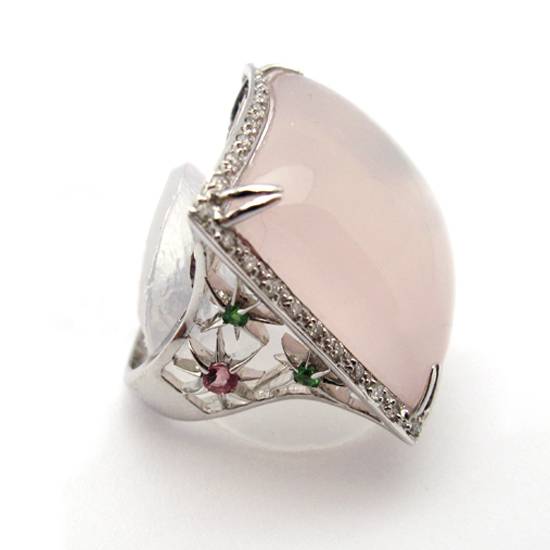 This is a 18K white gold ring with a large rose quartz. The cabochon quartz piece is in 4 double prong setting surrounded by an frame of diamonds.