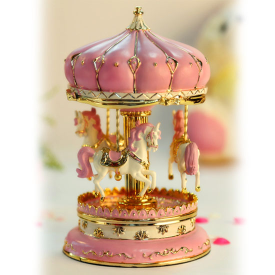 The rotating carousel music box comes with a pink and golden finish. It will give off amazing music effects to catch your attention. It is nice addition to your desktop and cupboard.