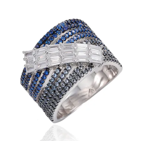 Round Blue Nano And White Cubic Zircon Silver Ring With Rhodium And Black Gold Plating