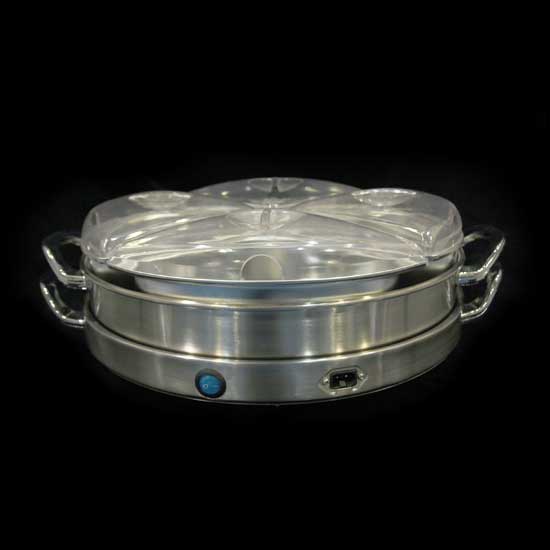 This Lazy Susan round buffet warmer comes with four 1 quart stainless steel trays for warming different foods at the same time. The serving pan and warming trays can be rotated for ease of use. This food warmer boasts stainless steel construction for long lasting performance.