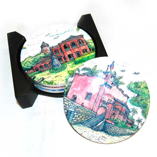 Presented here is a coaster in a round shape. This coaster features a beautiful print of a red house with artistic flair. Keep your tabletop from tea stains with this alluring coaster.