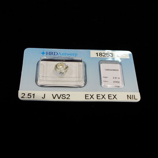 The round cut diamond totaling 2.51ct exhibits a clean, simple contour. It holds your attention with a dazzling display of light and a trace of color. The diamond is an ideal piece to enhance your jewelry designs.