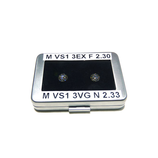 This is a pair of round diamonds weighing 2.30 and 2.33 carats respectively. The diamonds are crafted with superior craftsmanship. They exhibit excellent proportions, polish and symmetry. They are perfect for various brilliant single-diamond ring designs.