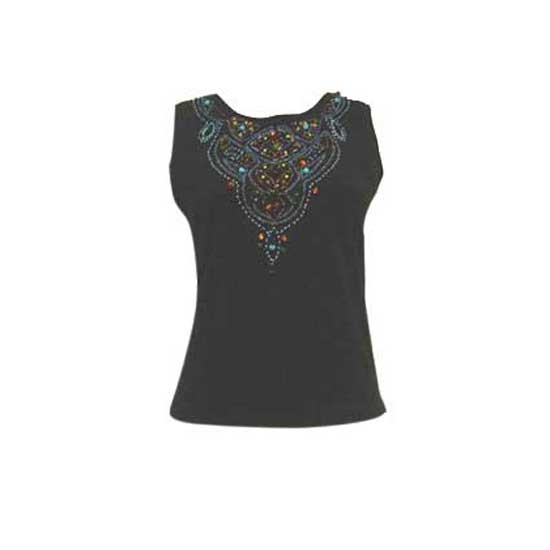 Highlighted is a ladies’ tank top showing a subtle yet elegant design. The top is designed in all black, highlighted by the beaded patterns at front. The shiny beads make this top a gorgeous choice for ladies.