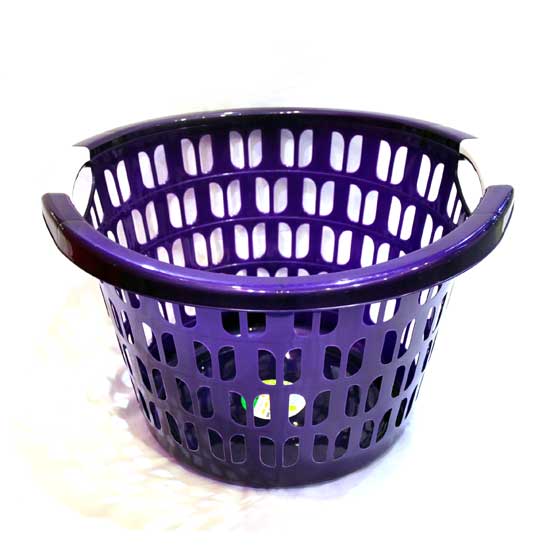 Featured here is a purple-colored round laundry basket in mesh plastic construction. The laundry basket is designed with two cutout handles for ease of use. Keep your laundry room neat and well organized with this practical laundry basket.