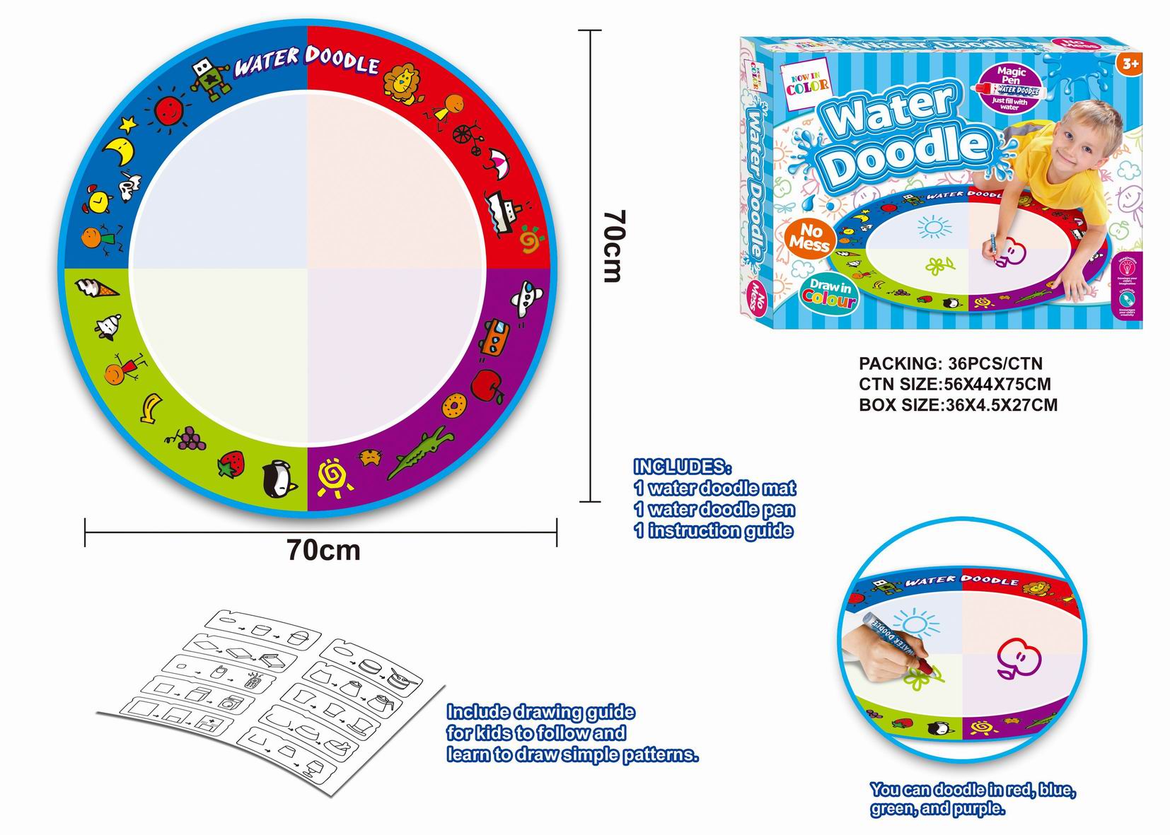 Round Size with 4 color drawing sections–Size: diameter 70 CM . The water doodle mat has four color sections that are green, purple,orange,blue. Suitable size enables you to paint on the desk or floor and share the coloring area while playing with a friend