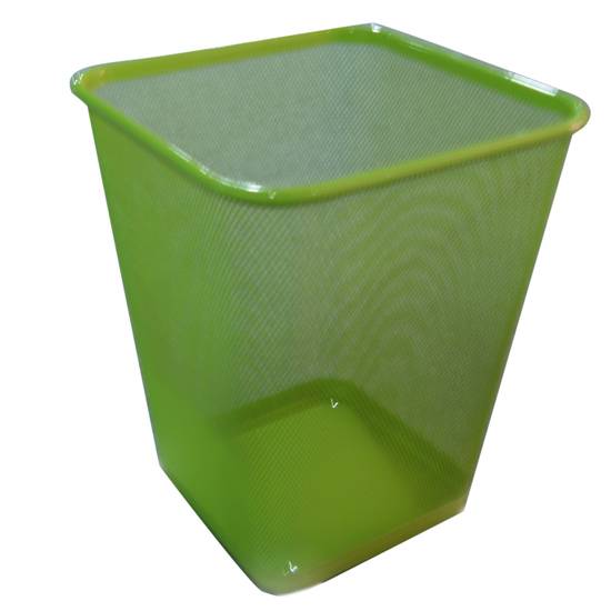 This is a rubbish bin or garbage bin which has a square opening. It is made of metal and has many small rhombus holes like rattan products.