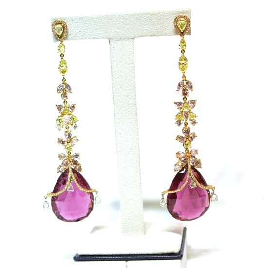 The pair of 18K gold earrings captures your attention with the tear-shaped rubellite gemstone. The color diamond accents add dazzling beauty. This pair of earrings makes a grand addition to your jewelry collection.