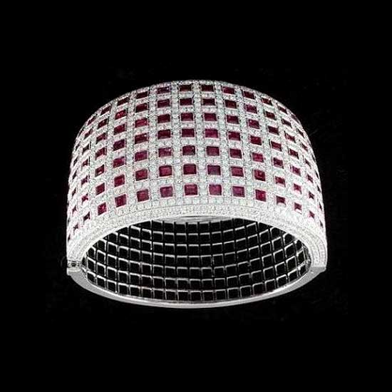 Add a sophisticated touch with this delicate bangle. The 18K white gold bangle is embellished with well-cut diamonds and rubies, showcasing an opulent touch. Complement your evening dress with this refined ruby bangle.