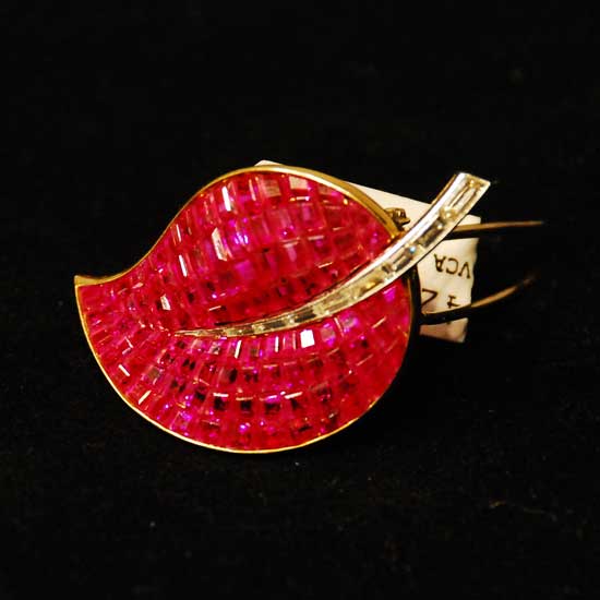 The 18K gold platinum-plated brooch comes in a teardrop shape in an intriguing red hue. It is encrusted with diamonds and ruby stones all over to give a glittering touch. Add a little sparkle to your outfit with this brooch.