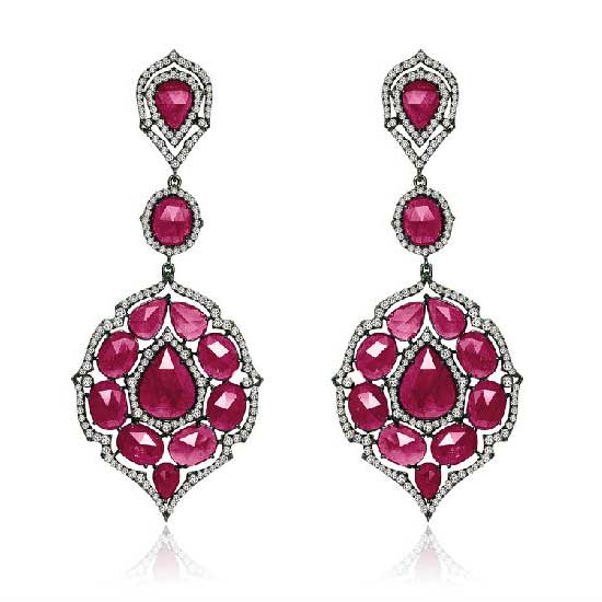 This is a pair of fashionable earrings that is accented with lustrous ruby gemstones. The gemstones come in round, teardrop and cushion shapes. Adorned with shimmering white stones, this pair of earrings will surely be an ideal choice to enhance your look.