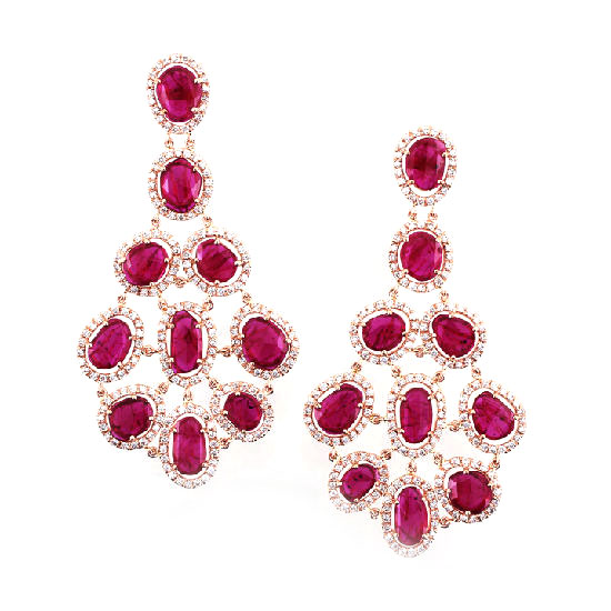 This is a pair of earrings that appeals to people with its deluxe and chic design. Each piece features an 18K rose gold mounting which is inlaid with ruby stones in vivid red. Each ruby stone is encircled with shimmering diamond elements for added charm.